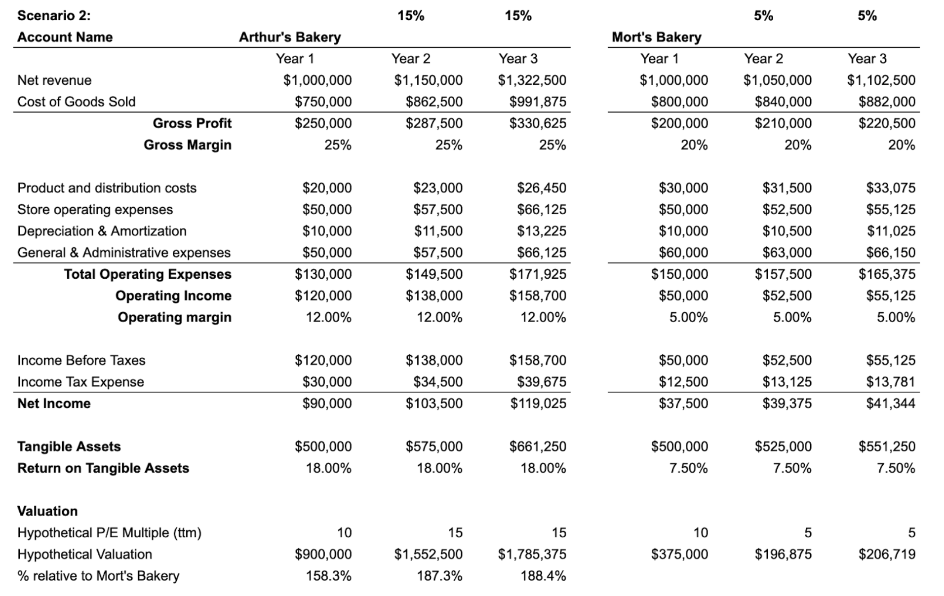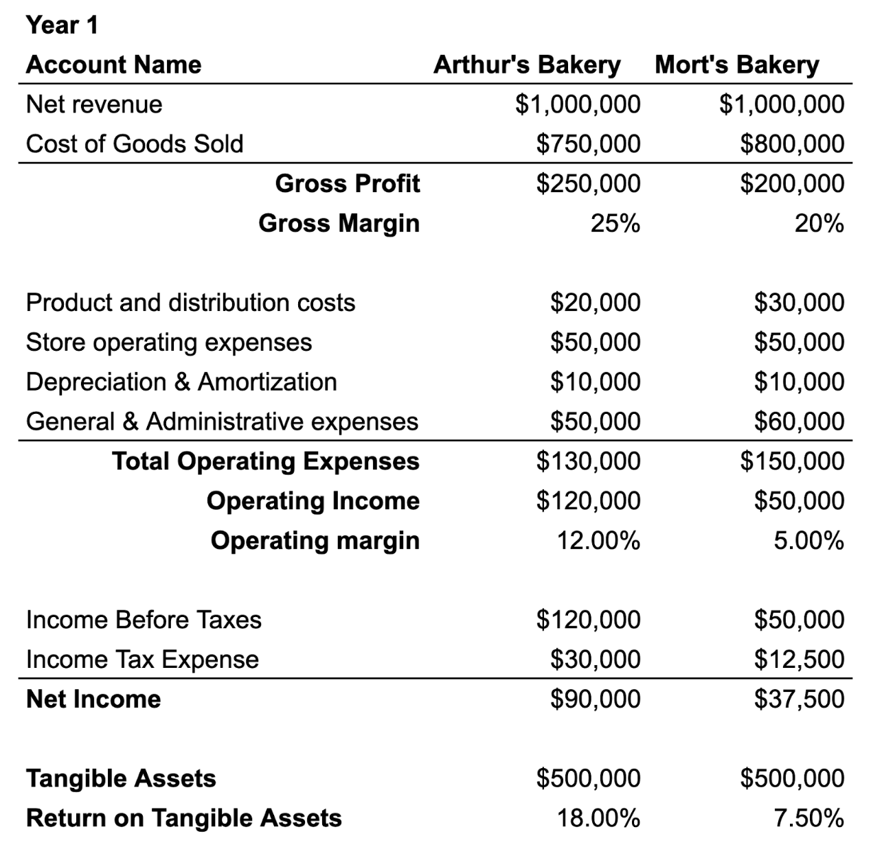 In short, you'd rather own Arthur's Bakery because it's a better business. It generates more cash for its owners, all things (assets) being equal.